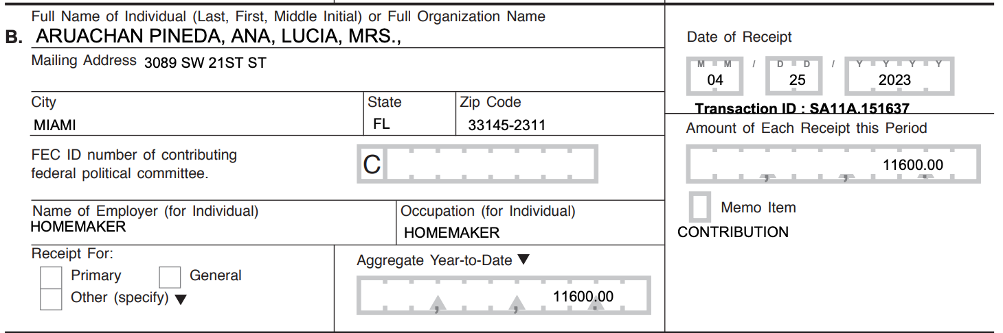 En pesos a la tasa actual, las donaciones totales suman unos 350 millones de pesos y la mayoría no ha sido a nombre propio. El grueso ha llegado a nombre de su esposa, Ana Lucía Pineda, quien se identifica ante las autoridades estadounidenses como ama de casa y es socia de algunas de las empresas.
