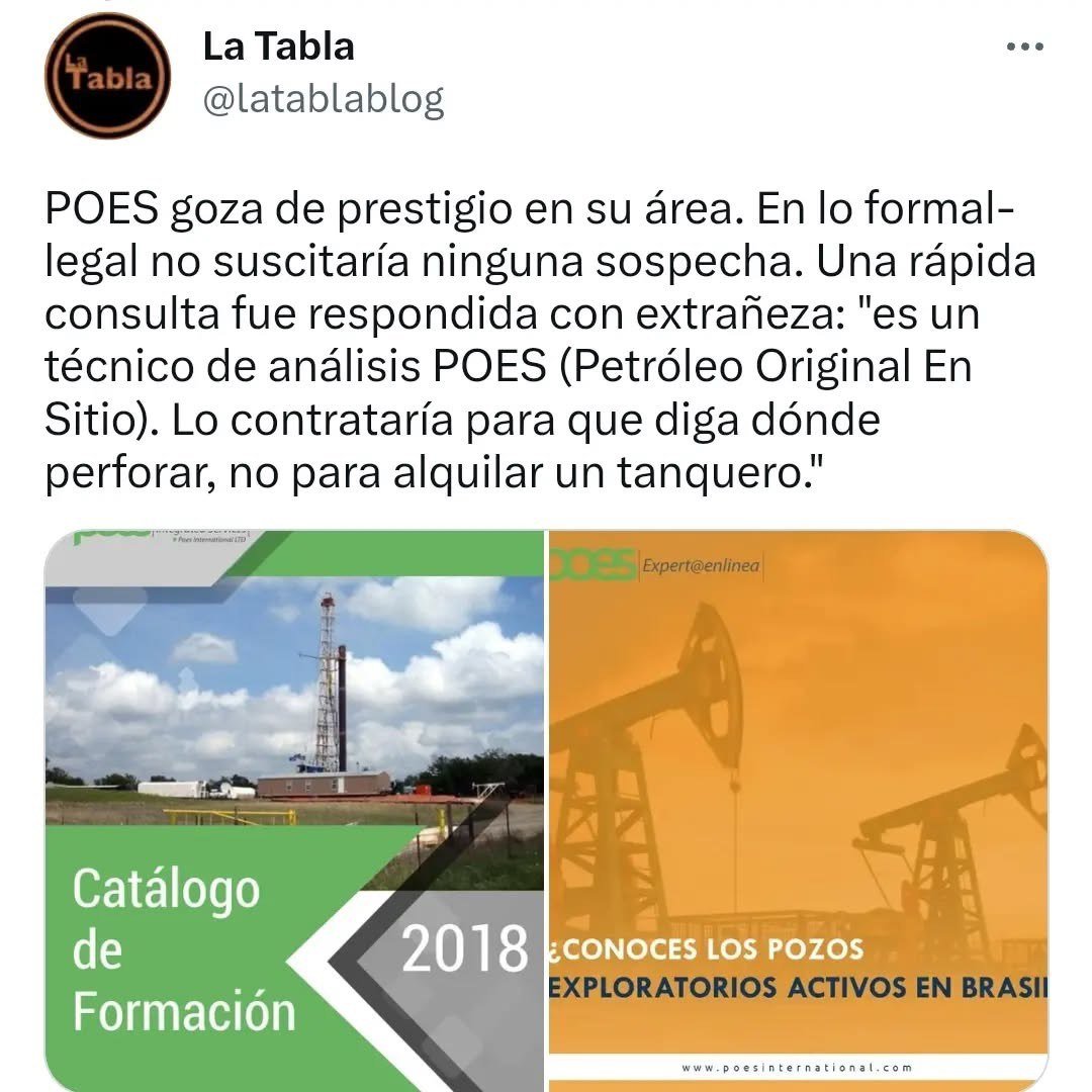 POES goza de prestigio en su área. En lo formal-legal no suscitaría ninguna sospecha. Una rápida consulta fue respondida con extrañeza: «es un técnico de análisis POES (Petróleo Original En Sitio). Lo contrataría para que diga dónde perforar, no para alquilar un tanquero.»