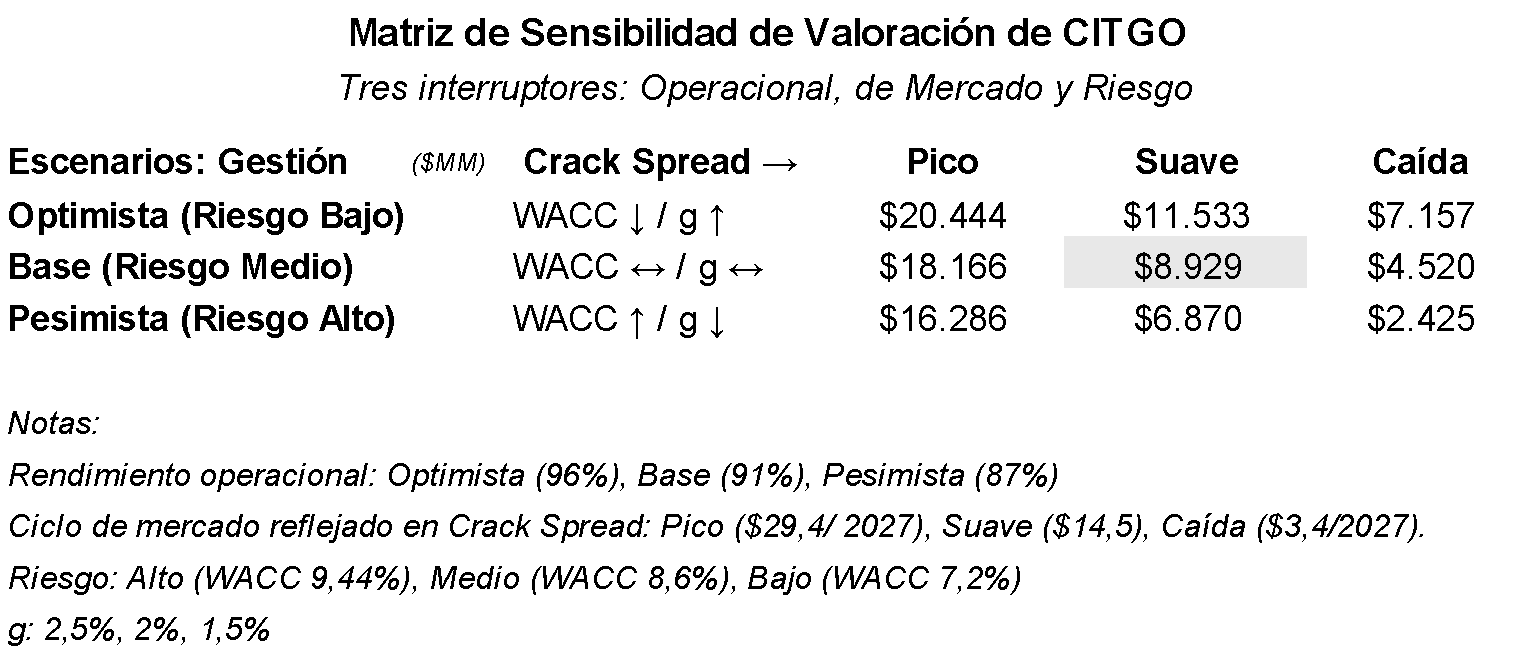 Volatilidad Horizontal (Impacto del ciclo de mercado): En el escenario Base, Riesgo Medio (la fila del medio) el cambio de EV entre CS Pico ($18.166 millones) y CS Caída ($4.520 millones) es de $13.646 millones. Esto muestra que el ciclo de mercado es el factor de mayor impacto en la valorización de CITGO en el corto plazo (Es a la vez el mayor destructor y constructor de valor).