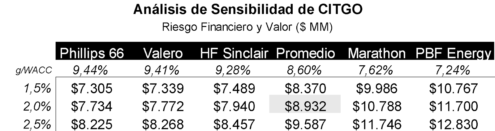 Exclusión del Riesgo Soberano de Venezuela: CITGO se valora bajo la premisa de ser una empresa libre de vínculos con Venezuela y sus riesgos políticos/soberanos. Esta exclusión es fundamental, ya que el riesgo Venezuela no es inherente al negocio operativo.