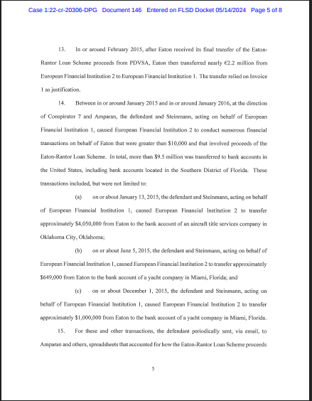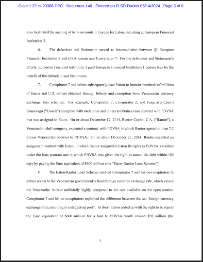 La trama, descrita por los fiscales como el “Esquema de Préstamo Eaton-Rantor”, funcionó bajo una lógica de arbitraje cambiario fraudulento. En diciembre de 2014, una empresa fachada venezolana llamada Rantor Capital C.A. otorgó un préstamo en bolívares a PDVSA por un monto de 7.2 mil millones. Poco después, Rantor asignó sus derechos de cobro a Eaton Global. Bajo el amparo de este contrato, PDVSA acordó cancelar la deuda no en la moneda local devaluada, sino mediante el pago del equivalente en euros a 600 millones de dólares.