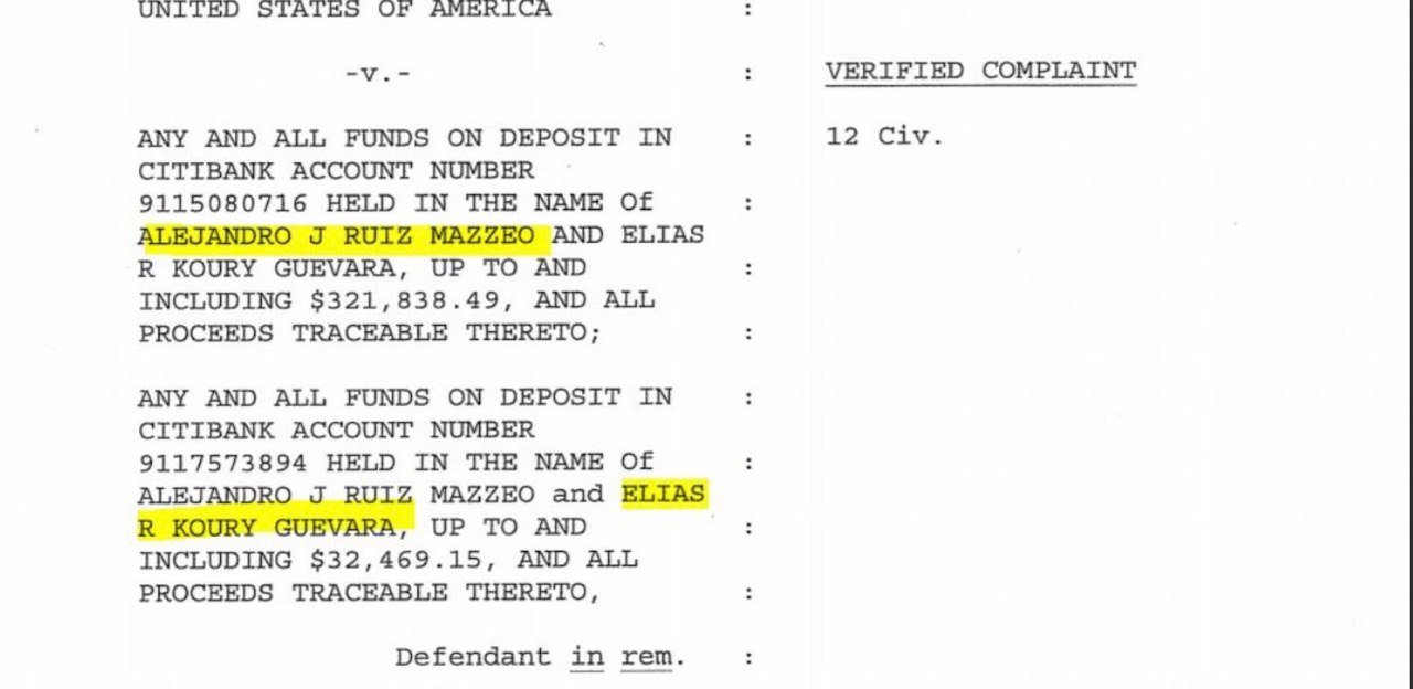 Durante el curso de las investigaciones de la DEA, se descubrió que las cuentas de Alejandro Josué Ruíz Mazzeo y Elías Ramón Koury Guevara formaban parte de la red de blanqueo de dinero del narcotráfico.