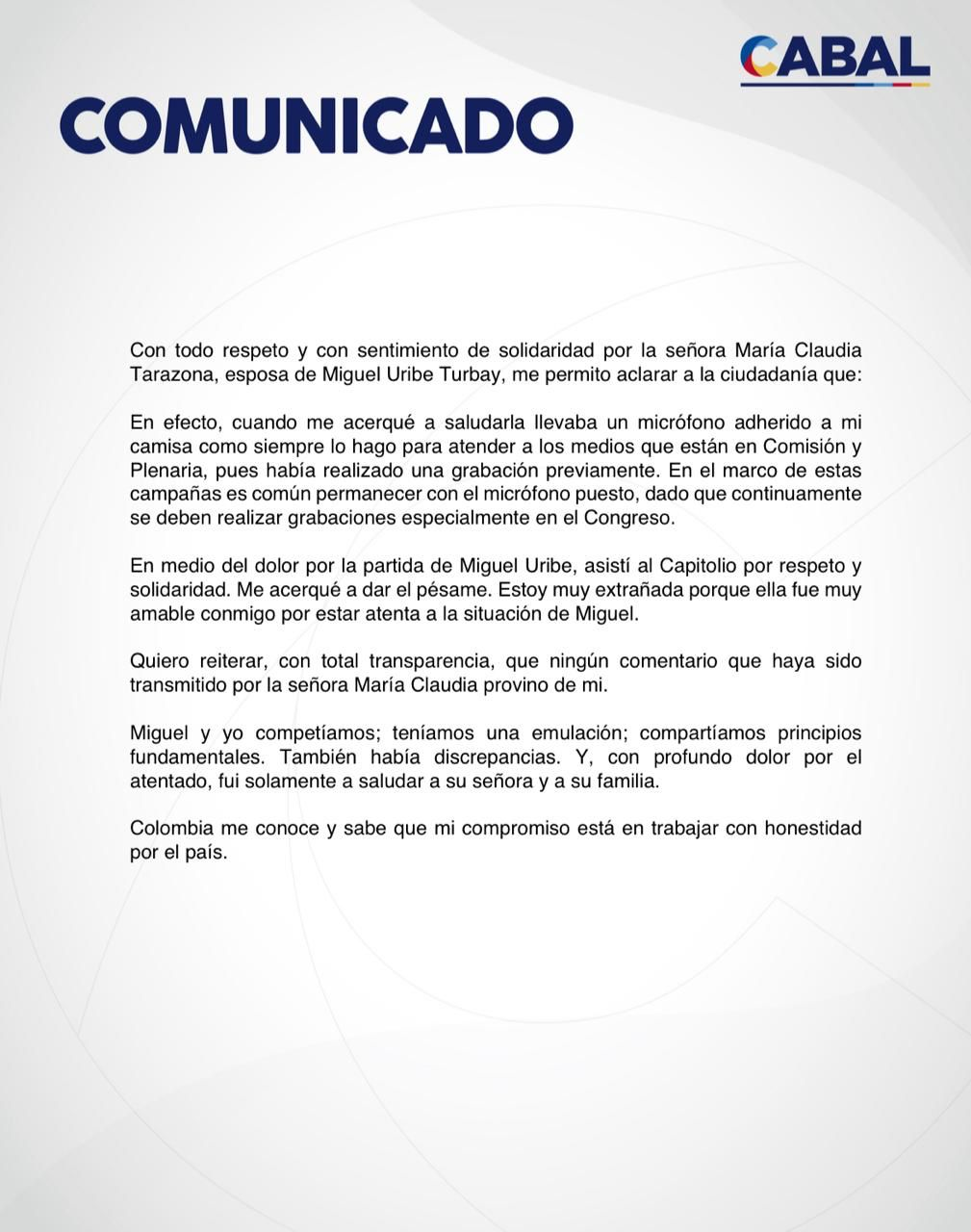 En un comunicado compartido en su cuenta de X, Cabal escribió: “Estoy muy extrañada porque ella fue muy amable conmigo por estar atenta a la situación de Miguel. Quiero reiterar, con total transparencia, que ningún comentario que haya sido transmitido por la señora María Claudia provino de mí”. Además, se conoció un video de un breve abrazo, del momento del pésame, por parte de Cabal con Tarazona, donde se evidencia un breve momento.