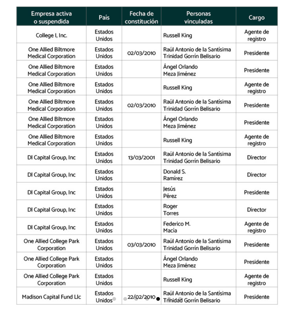 En los últimos 15 años, Gorrín ha creado o adquirido por lo menos 29 empresas, ubicadas en Estados Unidos, Venezuela, Panamá y en algunas islas del caribe. Estás compañías forman parte de su estructura corporativa extendida, con funciones clave como la adquisición de activos, triangulación financiera y registro de propiedad sobre bienes posteriormente incautados, lo cual sugiere su uso como vehículos de ocultamiento y legitimación de fondos.