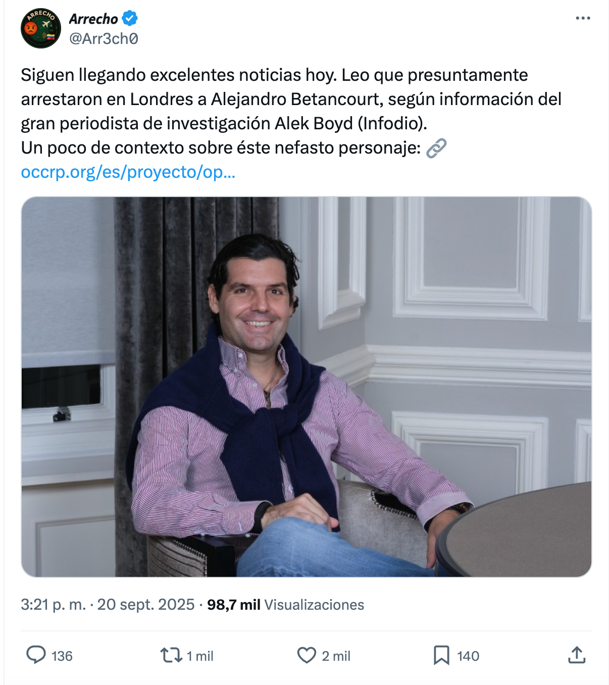 La policía británica ha detenido en Londres al empresario venezolano Alejandro Betancourt López por orden de la Audiencia Nacional y de la Fiscalía Anticorrupción por delitos presuntamente cometidos en España, según informan a EL PERIÓDICO fuentes del caso. Otras fuentes explican que tras unas horas este empresario ya habría recobrado la libertad.