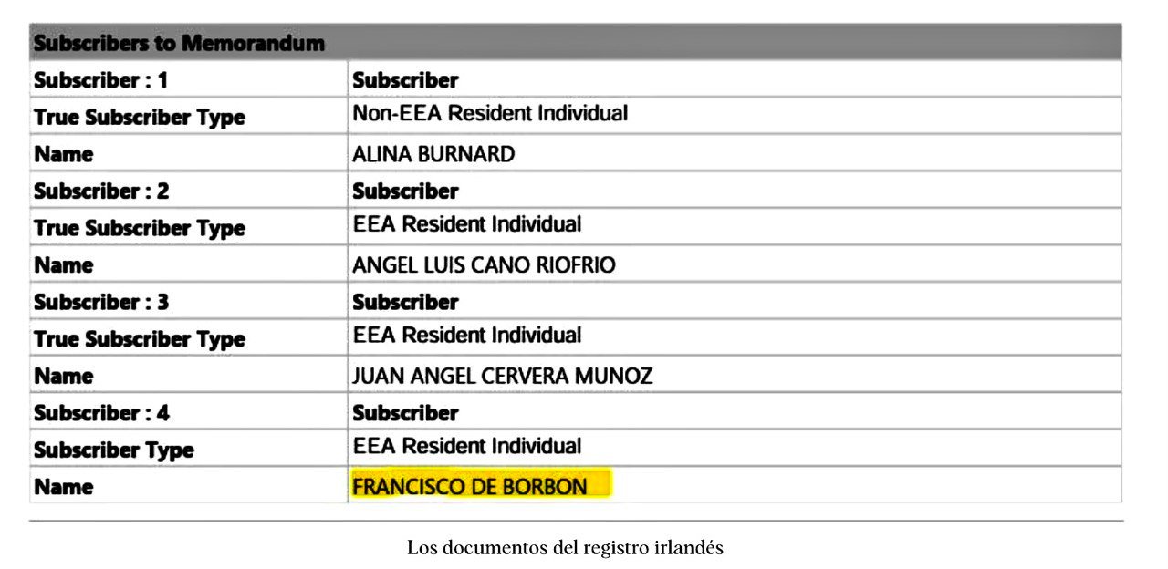 Los documentos de la compañía del registro oficial irlandés indican que entre sus fundadores figuran tanto Francisco de Borbón, sobrino quinto de Juan Carlos I, como Juan Ángel Cervera y Ángel Luis Cano.