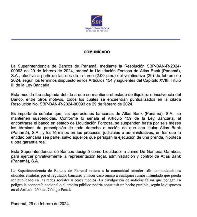 Atlas Bank (Panamá) fue intervenido y liquidado forzosamente por insolvencia en 2024, tras congelarse sus operaciones y surgir acusaciones de lavado de activos contra Nodus Bank (Puerto Rico). Atlas alegó que millones de dólares salieron sin autorización hacia el dueño de Nodus Bank entre 2022 y 2023.