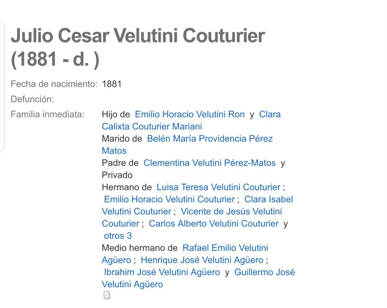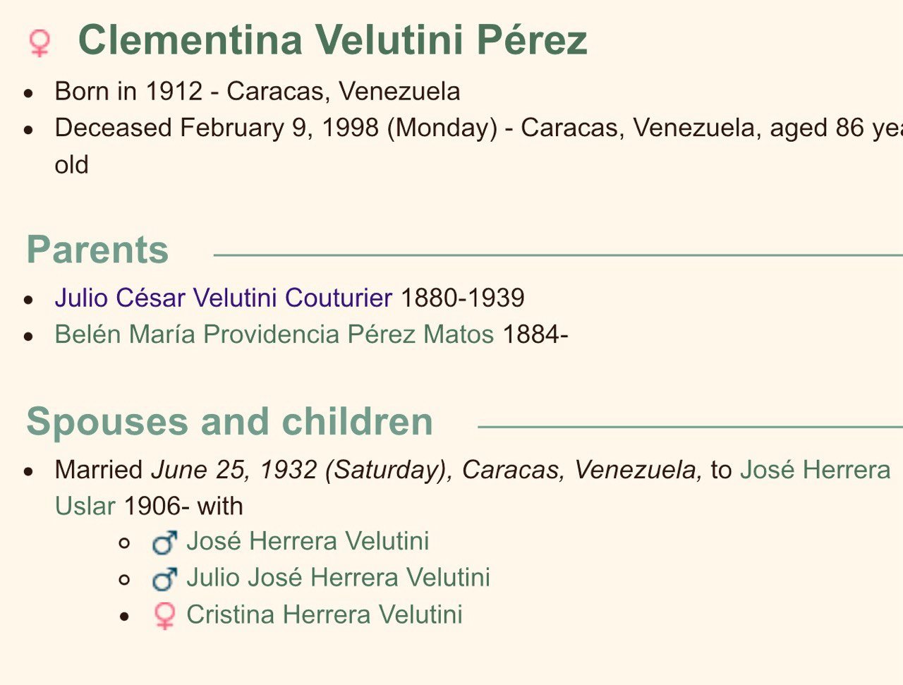 Clementina Velutini Pérez-Matos era hija de Julio César Velutini Couturier (1880-1939), quien, según la biografía de (alias) “Julio Herrera Velutini”, fundó en 1890 y presidió el Banco Caracas hasta 1930. “Herrera Velutini” asegura que, durante más de 100 años y hasta la venta del banco en 1998, las generaciones posteriores a Velutini Couturier presidieron o dirigieron el Banco Caracas. Sin embargo, los registros a los que tuvimos acceso no lo mencionan en ningún momento, y nos cuesta creer que, con tan solo 10 años de edad, fundara y presidiera dicho banco.