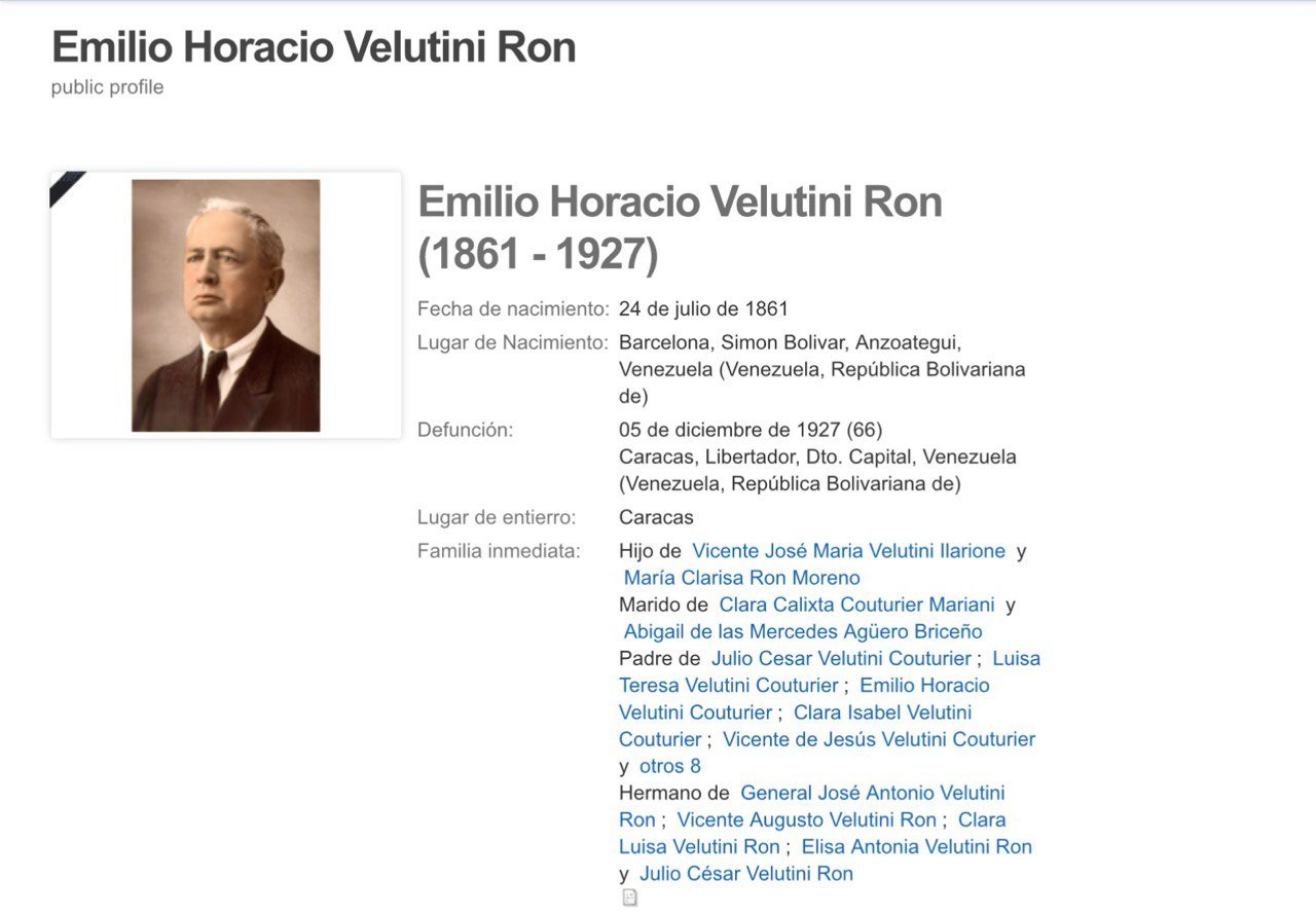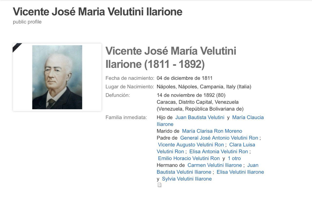 Vicente José María Velutini Ilarione (1811-1892), nacido el 4 de diciembre de 1811 en Nápoles, Campania, Italia, fue el padre de Emilio Horacio Velutini Ron.
