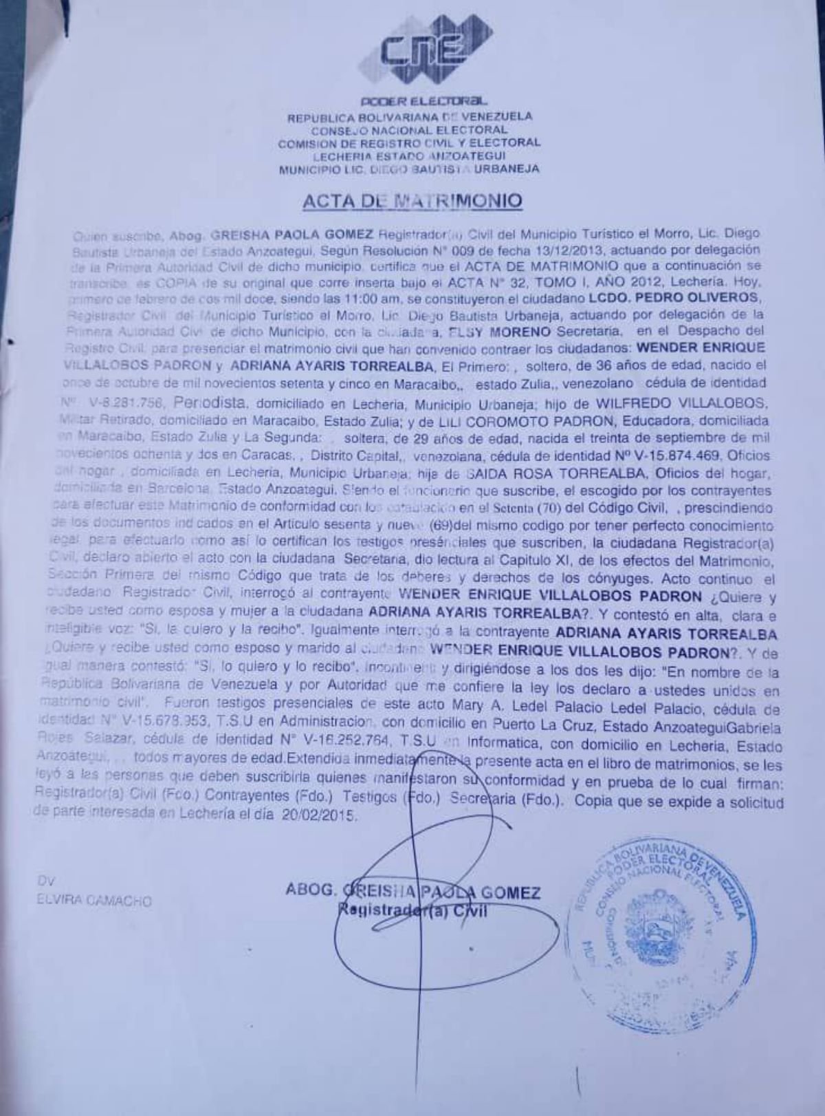 Acta de matrimonio entre Wender Villalobos y Adriana Torrealba, cuya autenticidad es negada por Villalobos. En el documento es identificado como “periodista”.
