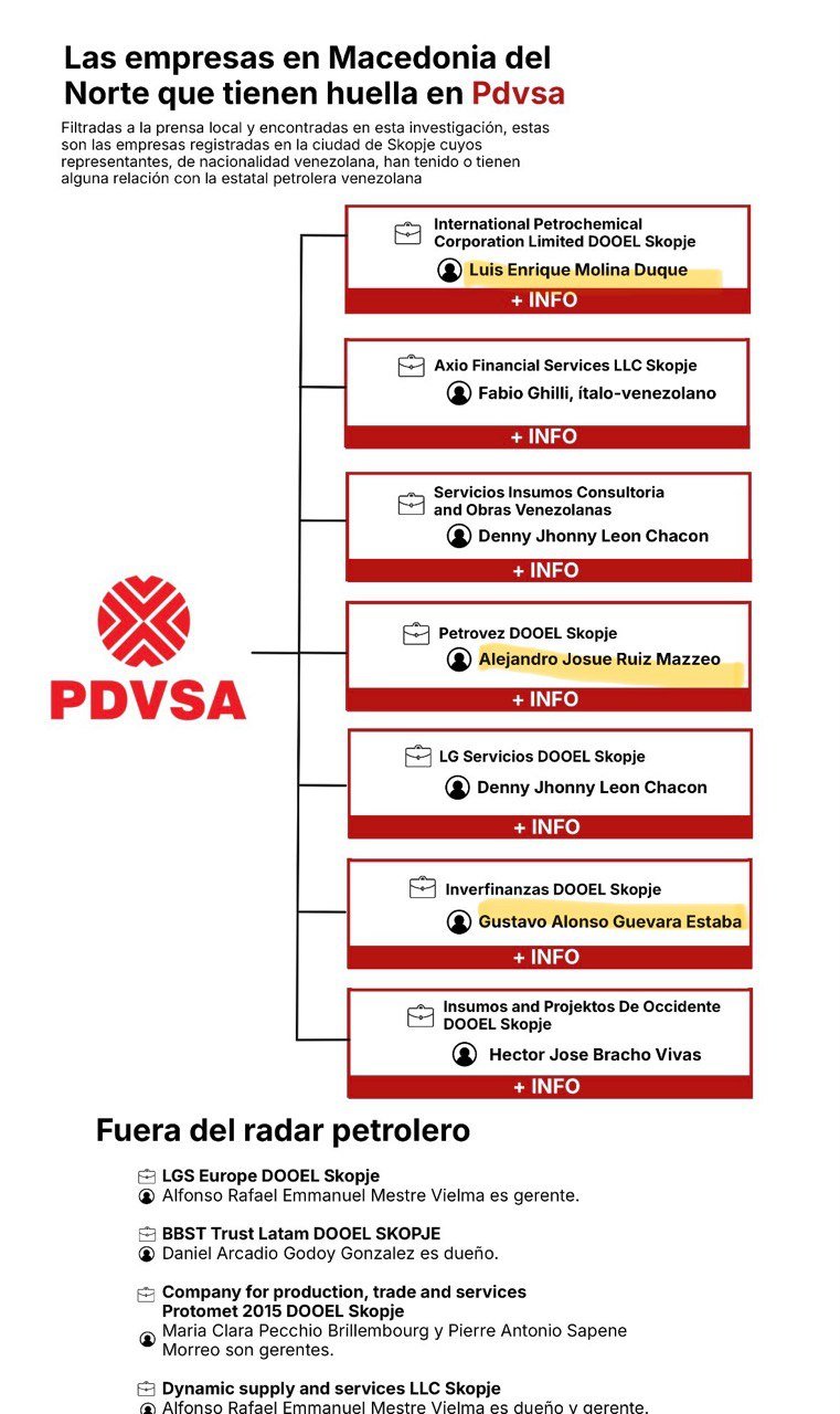 Gustavo Alonso Guevara Estaba, empleado de Ruiz Mazzeo en la firma venezolana Constructora Conkor C.A., también registró una empresa en Skopje llamada Inverfinanzas, el mismo día y en la misma dirección que la Petrovez macedonia.