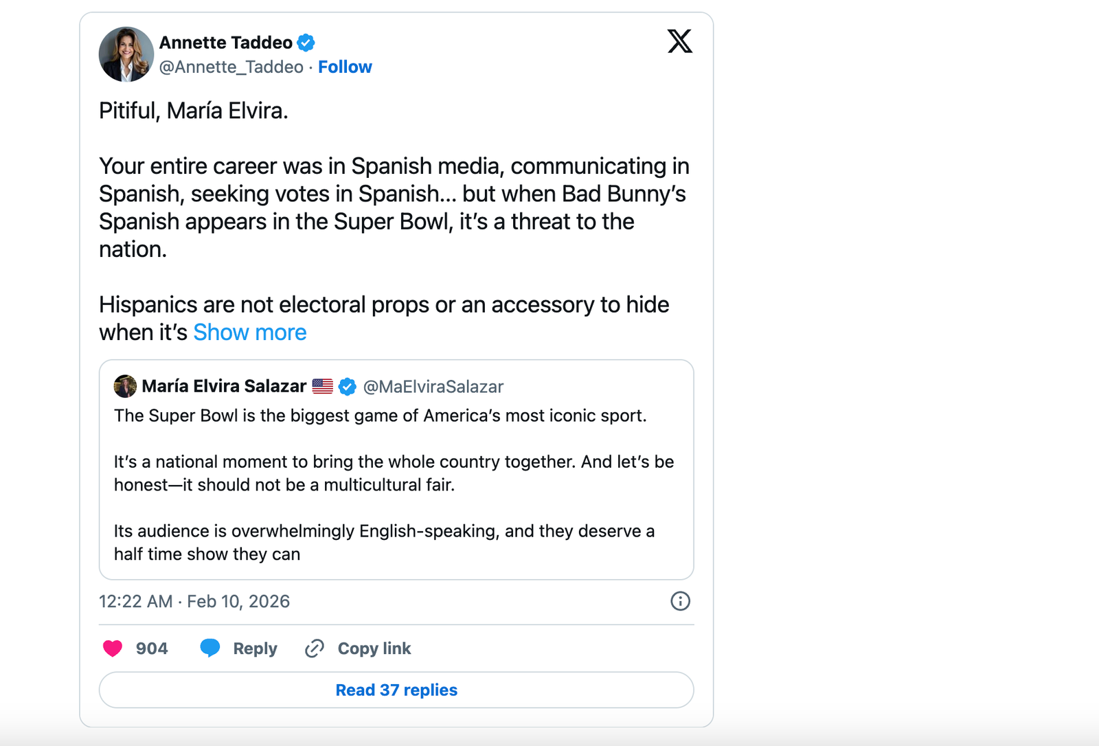 “Lamentable, María Elvira. Toda tu carrera fue en medios en español, comunicándote en español, buscando votos en español… pero cuando el español de Bad Bunny aparece en el Super Bowl, es una amenaza para la nación”, escribió la exsenadora demócrata en X. “Los hispanos no son utilería electoral ni un accesorio que se esconde cuando resulta incómodo. Somos parte del tejido de esta nación, punto. JUNTOS somos Estados Unidos, aunque a algunos les avergüence admitirlo.”