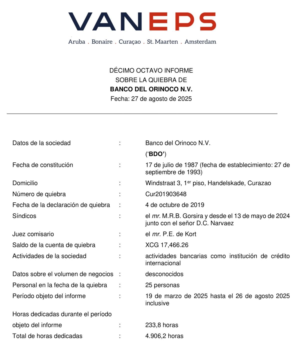 La firma de abogados VanEps, en su rol de síndico en el proceso de quiebra del Banco del Orinoco N.V. (BDO), ha hecho público su décimo octavo informe, un documento que detalla los avances y las complejidades del caso. El reporte, fechado el pasado 27 de agosto de 2025, actualiza la situación del banco, cuya declaración de quiebra se remonta al 4 de octubre de 2019.